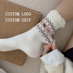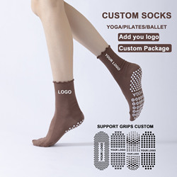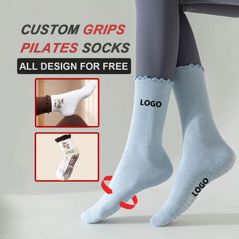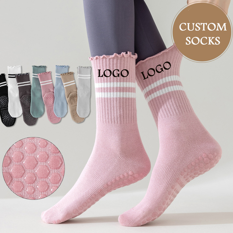 25 yeni yüksek kalite özel OEM kadınlar pamuk ekip fırfır nakış kaymaz spor salonu kavrama Pilates Yoga çorap toptan